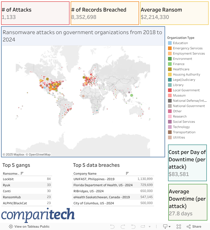 - 1,133 confirmed ransomware attacks on government organizations with the highest figures recorded in 2023 (231) and 2024 (193)